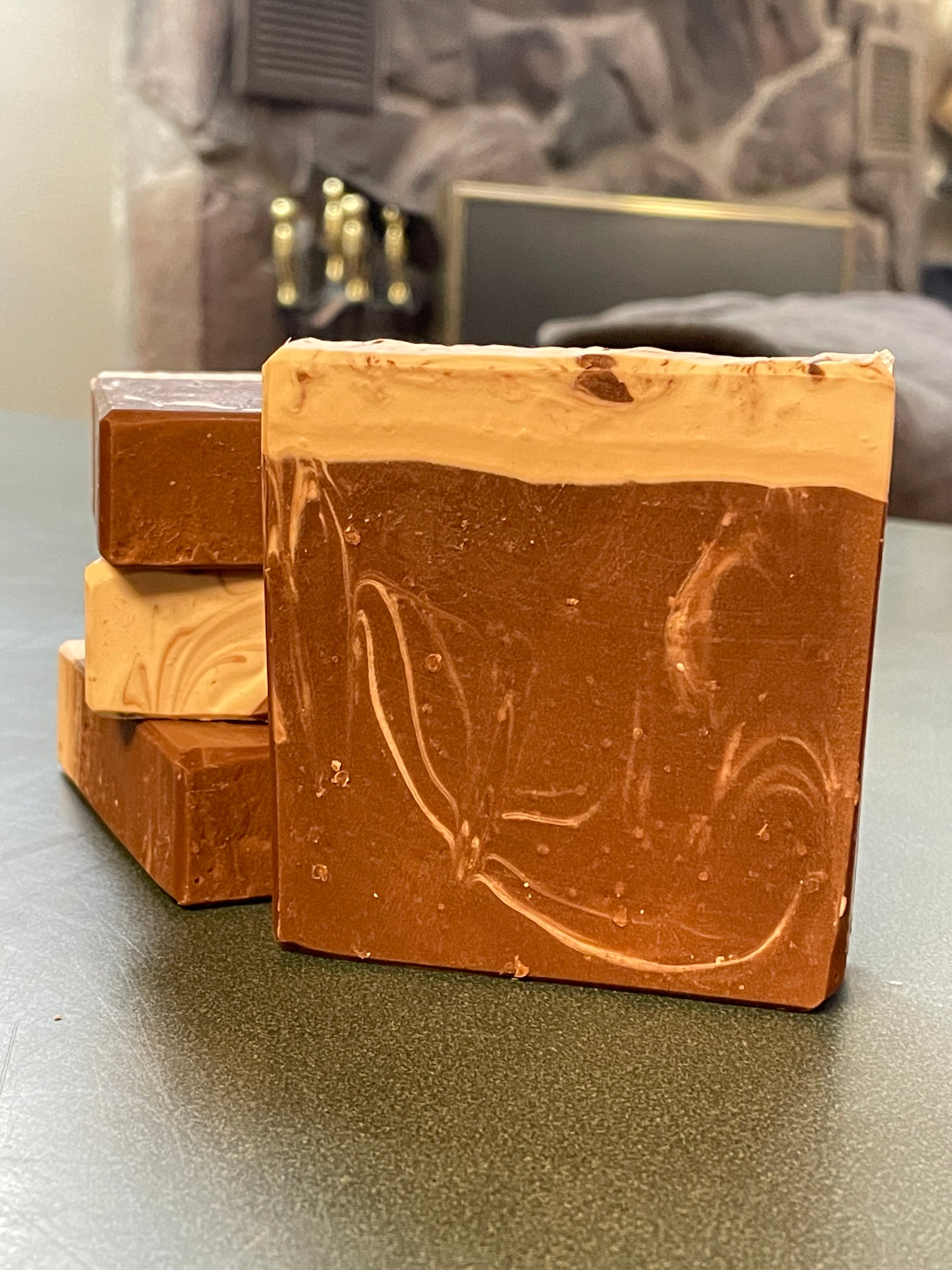 Ingredients: Water, Olive Oil, Coconut Oil, Lard, Lye (NaOH), Castor Oil, Cocoa Butter, Palm Oil, Shea Butter, Fragrance, Mica